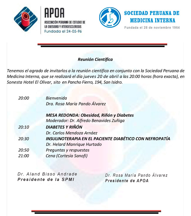 El día 20 de abril se realizó la reunión conjunta con la APOA en el Hotel El Olivar en San Isidro, contó con la presencia de la Dra. Rosa María Pando Álvarez , presidenta de la Asociación Peruana de Obesidad y Arterosclerosis y el Dr. Aland Bisso Andrade, Presidentente de la SPMI.